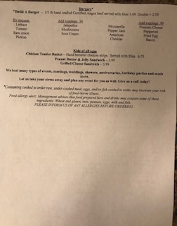 Hand patted Certified Angus beef with Lettuce, tomato, onion and pickles. Add additional ingredients: Jalapenos, mushrooms, mozzarella, pepper jack, American, cheddar, Pimento Cheese, Pepperoni, Fried egg and bacon.